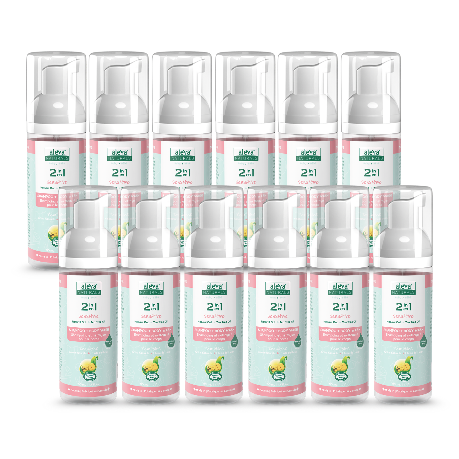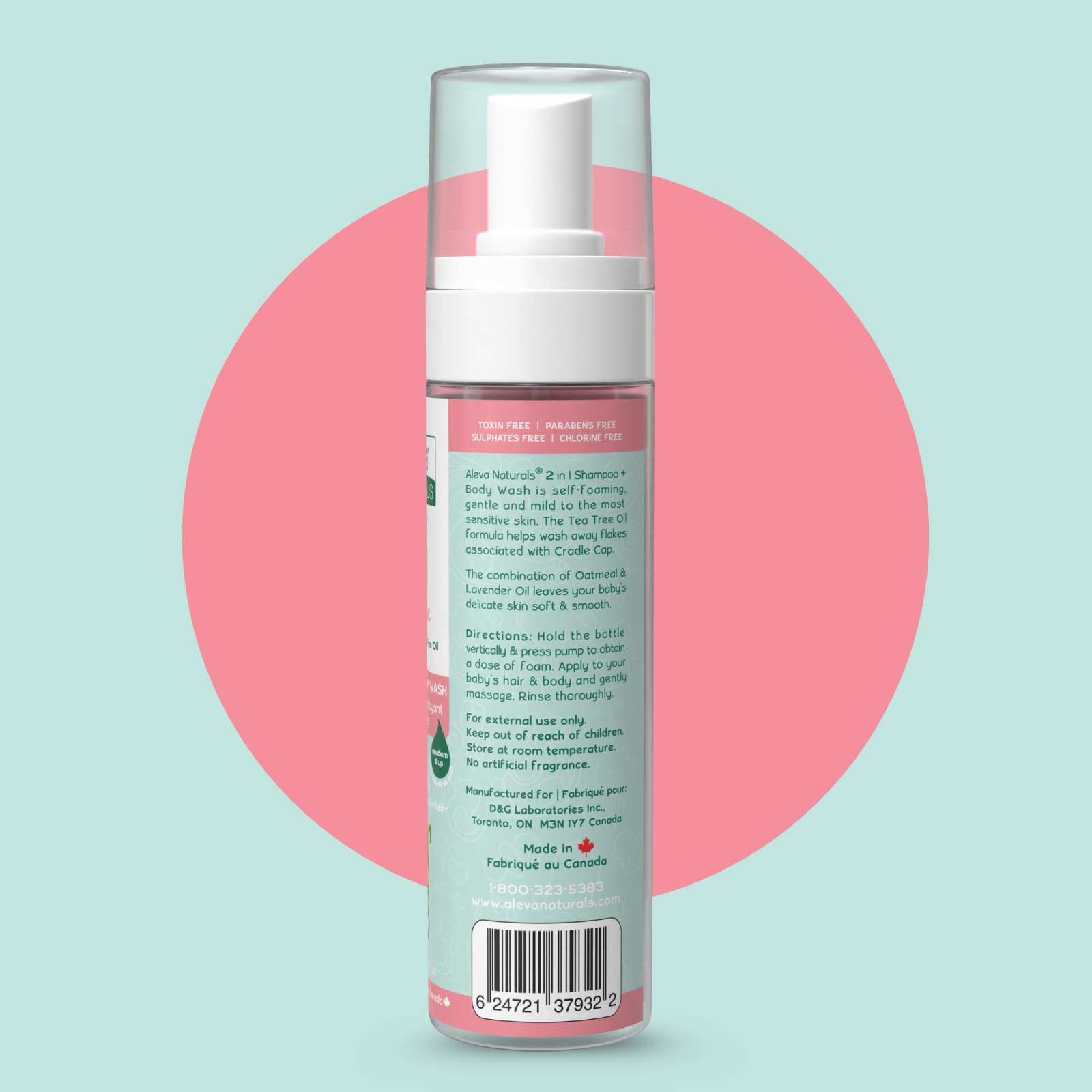 Gently cleanse your baby's skin and hair with Aleva Naturals 2 in 1 Shampoo + Body Wash. Specially formulated to be gentle on your newborn's sensitive skin, this baby shampoo & wash leaves skin and hair clean and touchably soft. This wash comes in a unique self-foaming bottle to make bath time easier for babies and parents. The pH balance ensures that this Shampoo + Body Wash is mild and gentle on eyes and sensitive areas. The Tea Tree Oil formula helps wash away flakes associated with Cradle Cap, while the combination of Oatmeal Extract and Chamomile Oil leaves your baby's skin soft and smooth. This baby shampoo & wash is hypoallergenic, free of parabens, phthalates, sulfates, and dyes. Like all Aleva Naturals products, the 2 in 1 Shampoo + Body Wash is made with premium quality ingredients, so you can enjoy a safe product without harsh chemicals or additives. Formulated for newborns & babies.