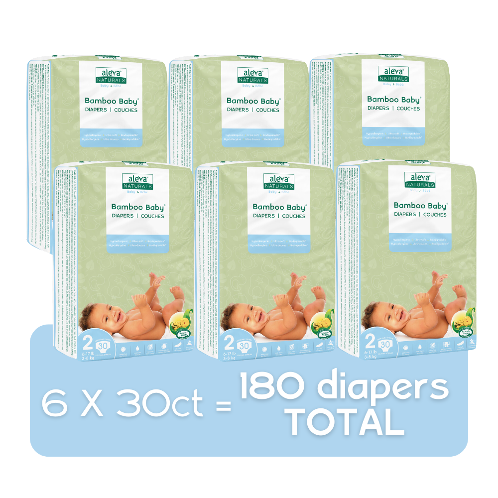 Keep your baby's bottom clean & comfortable with the Aleva Naturals Bamboo Baby Diapers. Our diapers top and bottom layers are made from bamboo fibres called Bamboo Kun. Together with the extra absorbability and breathable back layers, these diapers will help keep your baby’s bottom soft, supple and silky smooth. Plus, our diapers have a 3-line wetness indicator that changes from yellow to green, to let you know when it is time for a change & flexible side panels and pocketed back waistband ensure a snug and comfy fit. The Bamboo Baby diapers are feathery soft, durable, and biodegradable. Designed to provide maximum comfort for your baby, these eco-friendly diapers will be your new go-to. Like all Aleva Naturals products, the Bamboo Baby Diapers are made with premium quality ingredients, so you can enjoy a safe product without harsh chemicals or additives.