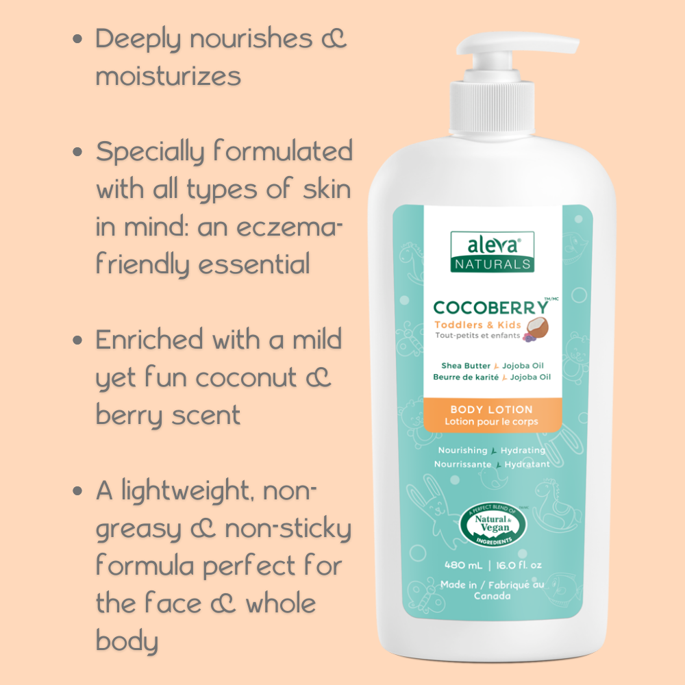 Take care of your kid's delicate skin with Aleva Naturals COCOBERRY Body Lotion. This unique, non-greasy, gentle moisturizer made with a blend of Shea Butter, Jojoba Oil and Aloe Vera that help to nourish, soothe & soften dry and sensitive skin. It's lightweight, super hydrating and infused with our unique COCOBERRY™ scent, and it's great for face & body. This body lotion is hypoallergenic, free of  parabens, phthalates, sulfates, and dyes. Like all Aleva Naturals products, the COCOBERRY Body Lotion is made with premium quality ingredients, so you can enjoy a safe product without harsh chemicals or additives.