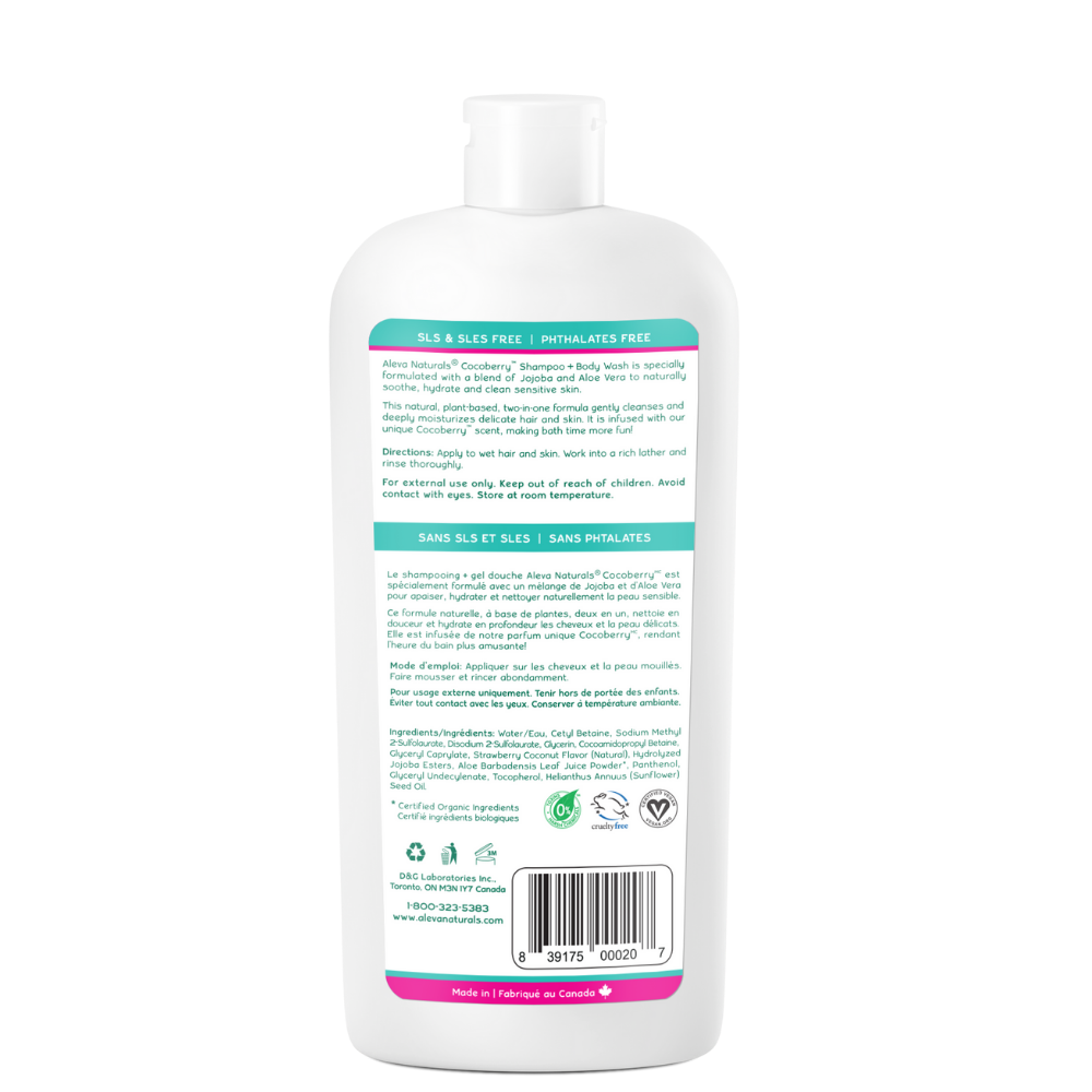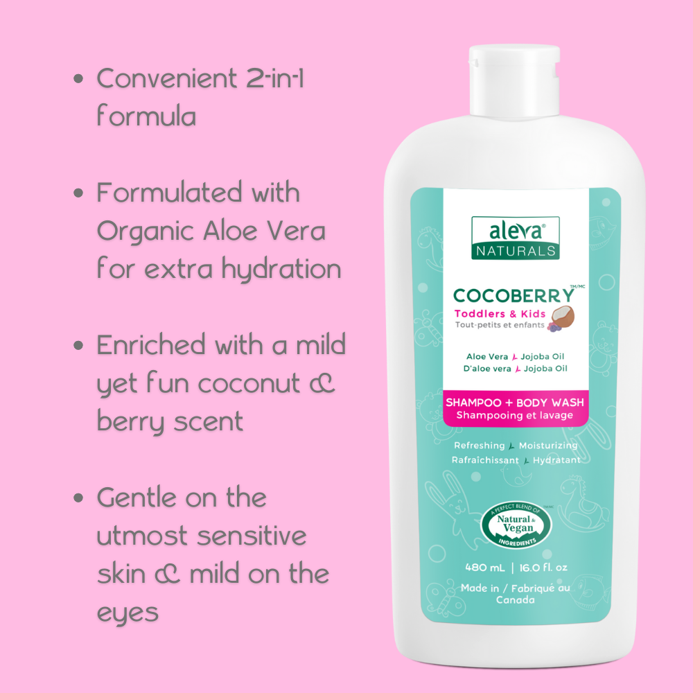 Take care of your kid's delicate hair with Aleva Naturals COCOBERRY Shampoo + Body Wash. Specially formulated with a blend of Jojoba and Aloe Vera to naturally soothe, hydrate and clean sensitive skin. This unique two-in-one formula gently cleanses and deeply moisturizes delicate hair and skin. It's infused with our unique COCOBERRY™ scent, making bath time more fun! This shampoo + body wash is hypoallergenic, free of parabens, phthalates, sulfates, and dyes. Like all Aleva Naturals products, the COCOBERRY Shampoo + Body wash is made with premium quality ingredients, so you can enjoy a safe product without harsh chemicals or additives.