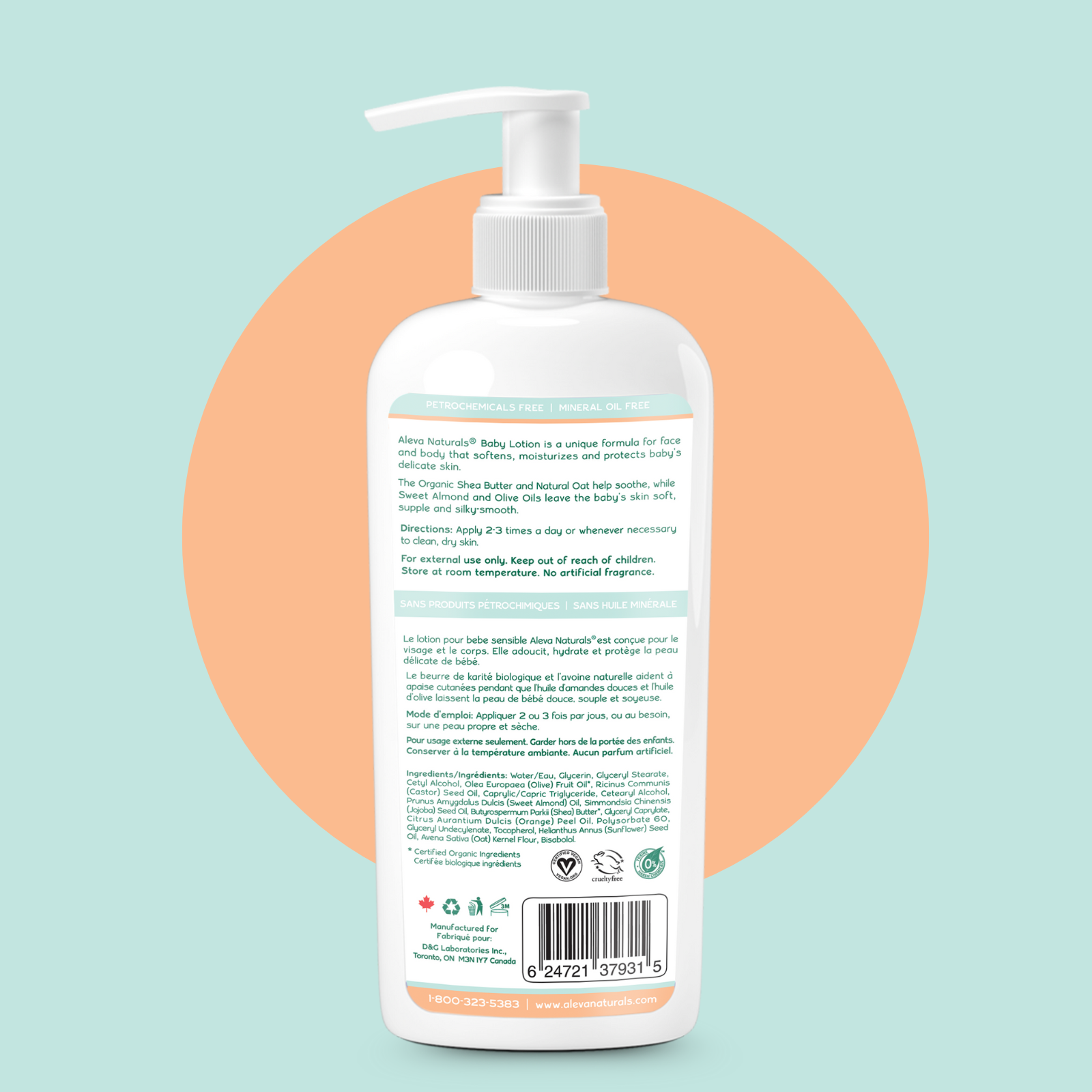 Gently moisturize your baby's skin with Aleva Naturals Baby Lotion Face + Body Moisturizer. Specially formulated to be gentle on your newborn's sensitive skin, this baby lotion leaves skin feeling supple & silky smooth. Enriched with a soothing blend of Oatmeal Extracts, Bisabolol, Jojoba oil and Vitamin E, that help lock in moisture to soothe and nourish baby’s skin. This baby lotion is hypoallergenic, free of parabens, phthalates, sulfates, and dyes. Like all Aleva Naturals products, the Daily Soothing Moisturizer is made with premium quality ingredients, so you can enjoy a safe product without harsh chemicals or additives. Formulated for newborns & babies.
