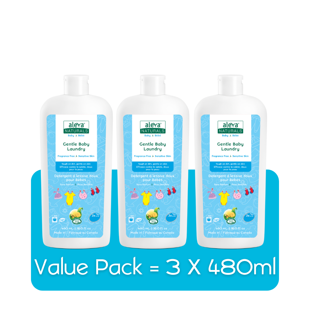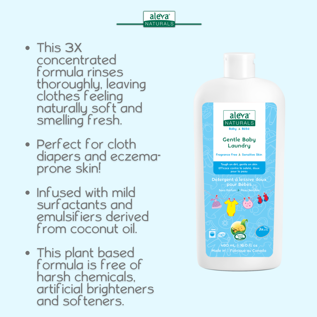 Gently wash baby's clothes with the Aleva Naturals Gentle Baby Laundry. Enriched with a unique blend of emulsifiers and cleansers derived from coconut oil, this detergent helps penetrate clothing & fabrics to remove stains and odours for a pure and powerful clean. This 3X concentrated formula rinses thoroughly, leaving your baby’s clothes feeling naturally soft and smelling fresh, it actually gets the job done, Plus, this plant based formula is gentle on your baby's delicate & sensitive skin. This laundry detergent is hypoallergenic, free of SLS/SLES & Dioxane. Like all Aleva Naturals products, the Gentle Baby Laundry is made with  premium quality ingredients, so you can enjoy a safe product without harsh chemicals or additives. Formulated for babies, suitable for the entire family.